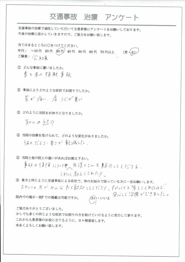 会社員 30代 女性(交通事故治療・首の痛み)|群馬県高崎市で交通事故のケガ、腰痛、捻挫治療なら「かねしま整骨院」へ