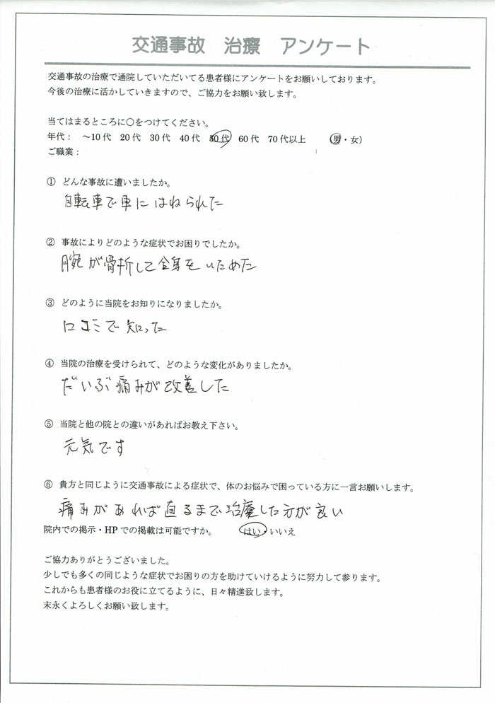 50代 男性(交通事故治療・腕の骨折)|群馬県高崎市で交通事故のケガ、腰痛、捻挫治療なら「かねしま整骨院」へ