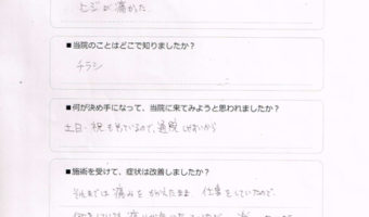 どのような症状でお困りでしたか? 肩こり、腰痛 当院のことはどこで知りましたか? 母のすすめで 何が決め手になって、当院に来てみよう...