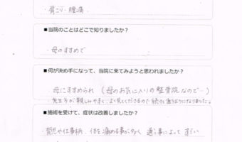 高崎市 田野内 様(肩こり、腰痛) 肩こり腰痛 2017.09.04 どのような症状でお困りでしたか? 肩こり、腰痛 当院のことはどこで知りましたか? 母のすすめで 何が決め手になって、当院に来てみよう... 続きはこちら